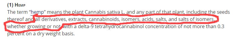 Our argument builds on Rod Kight’s analysis here + here. Although we disagree on the Analogue Act analysis1, the plain meaning discussion of “derivative” is sound. And as explained below, we agree that whether delta-8 is synthetic is beside the point. But that just scratches the surface. There’s a better argument available that no one has made yet.